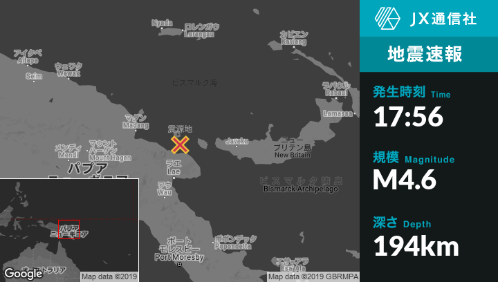 | 震源地 | パプアニューギニアのLaeから北131kmの地点 |