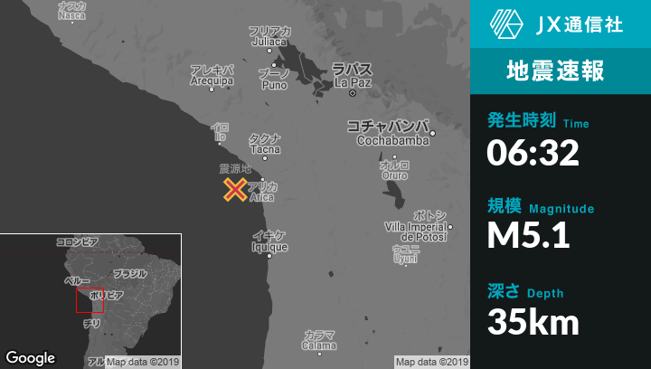 9月02日 06:32頃、チリのAricaから西南西72kmの地点でM5.1の地震がありました。