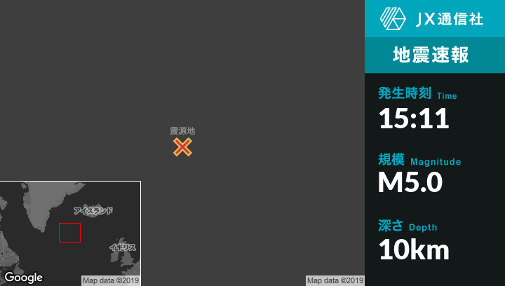 12月20日 15:11頃、アイスランドのGrindavikから南西628kmの地点でM5.0の地震がありました。