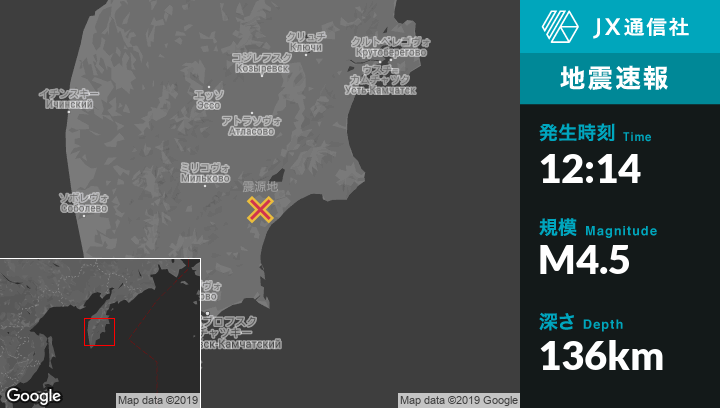 12月24日 12:14頃、ロシアのYelizovoから北北東170kmの地点でM4.5の地震がありました。