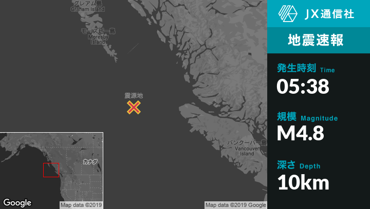 12月26日 05:38頃、カナダのPort Hardyから西203kmの地点でM4.8の地震がありました。