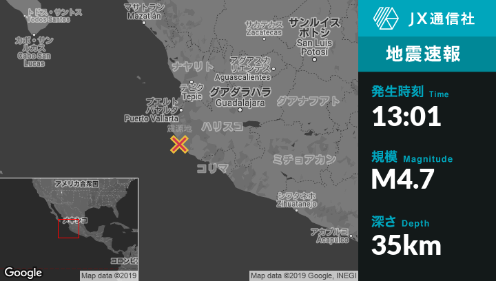 | 震源地 | メキシコのTomatlanから南南西21kmの地点 |
