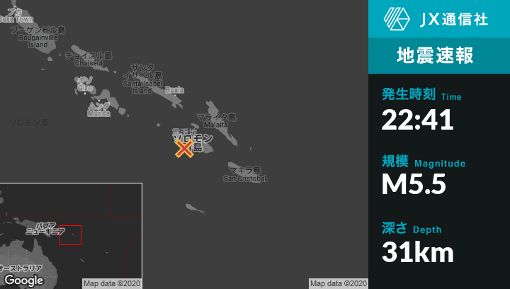 1月02日 22:41頃、ソロモン諸島のHoniaraから南24kmの地点でM5.5の地震がありました。