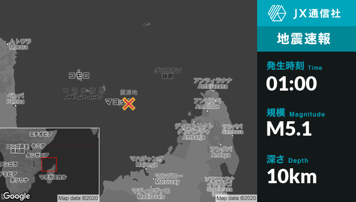 | 震源地 | MayotteのPamandziから東27kmの地点 |