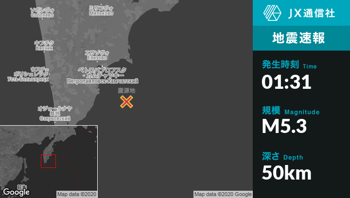 | 震源地 | ロシアのPetropavlovsk-Kamchatskiyから南東126kmの地点 |