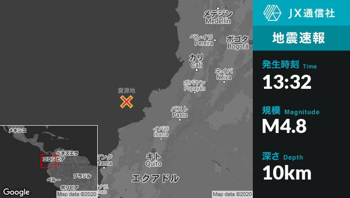 1月17日 13:32頃、コロンビアのTumacoから西北西104kmの地点でM4.8の地震がありました。