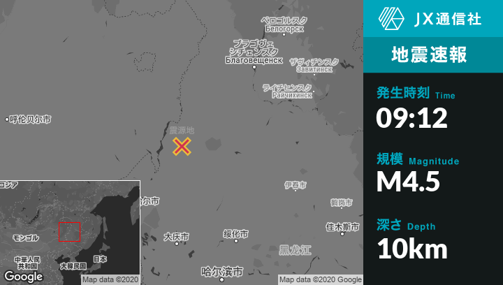 2月07日 09:12頃、中国のNeheから北東43kmの地点でM4.5の地震がありました。