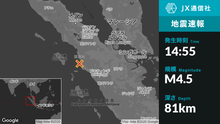 | 震源地 | インドネシアのPadangsidempuanから南南西73kmの地点 |