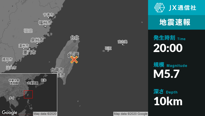 2月15日 20:00頃、台湾のHualianから南南西16kmの地点でM5.7の地震がありました。