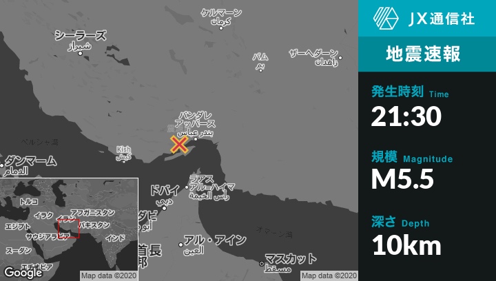 2月16日 21:30頃、イランのBandar 'Abbasから西52kmの地点でM5.5の地震がありました。