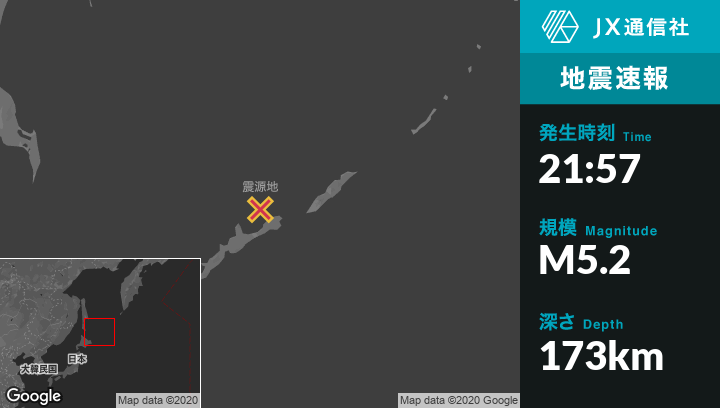 2月23日 21:57頃、ロシアのKuril'skから北東67kmの地点でM5.2の地震がありました。