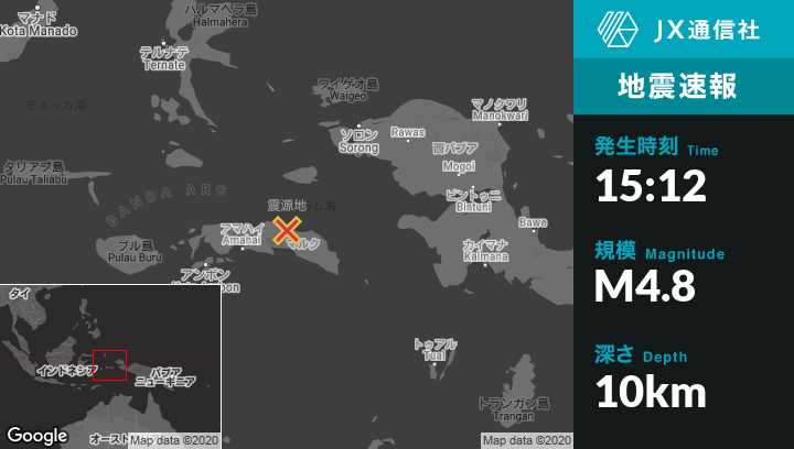 3月20日 15:12頃、インドネシアのAmahaiから東北東114kmの地点でM4.8の地震がありました。