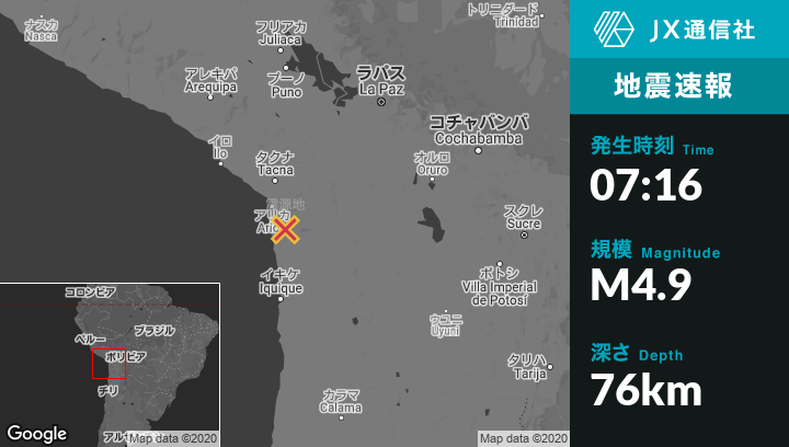 3月24日 07:16頃、チリのAricaから南東46kmの地点でM4.9の地震がありました。