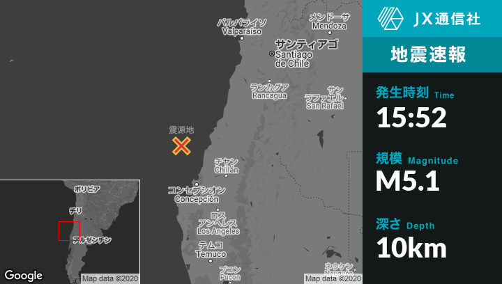 3月25日 15:52頃、チリのTomeから北北西108kmの地点でM5.1の地震がありました。