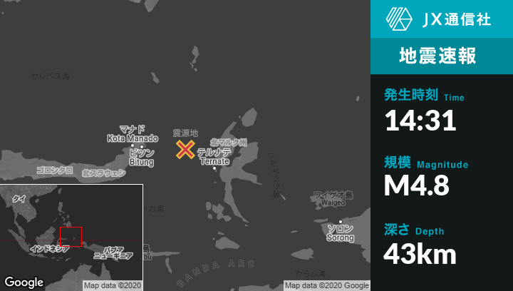 | 震源地 | インドネシアのKota Ternateから北西125kmの地点 |