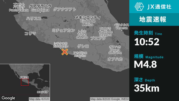 4月07日 10:52頃、メキシコのPetatlanから東南東9kmの地点でM4.8の地震がありました。