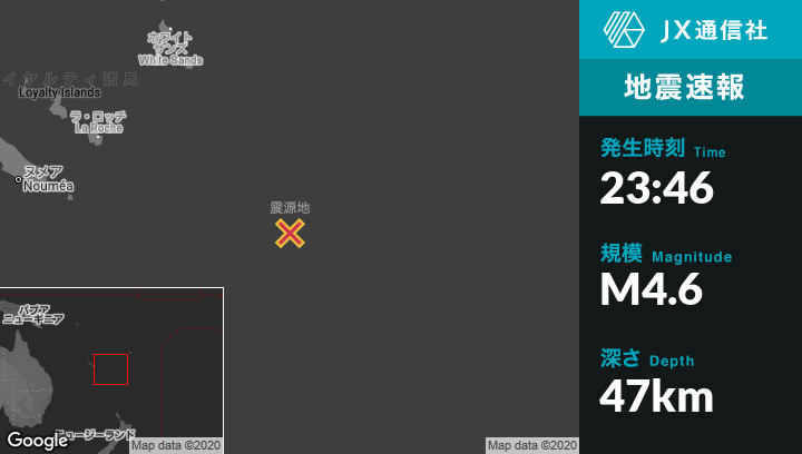 | 震源地 | ニューカレドニアのIle Hunterから南南西86kmの地点 |