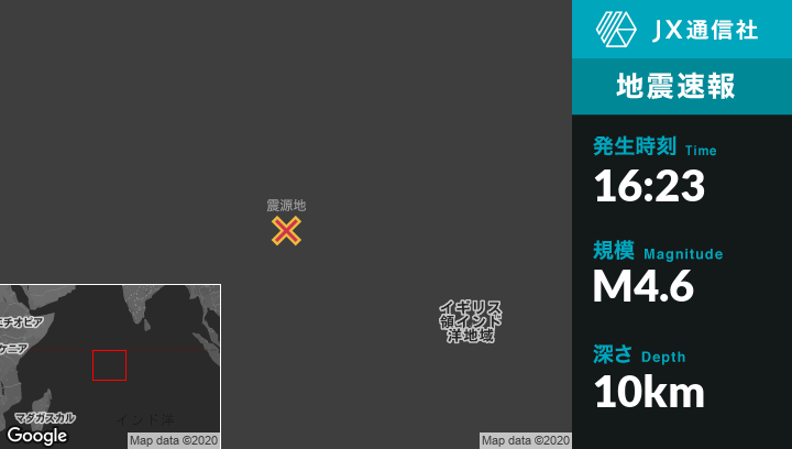 4月11日 16:23頃、イギリス領インド洋地域のDiego Garciaから西北西457kmの地点でM4.6の地震がありました。