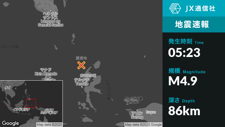 | 震源地 | インドネシアのTobeloから北西105kmの地点 |