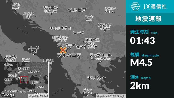 | 震源地 | アルバニアのShijakから北北西16kmの地点 |