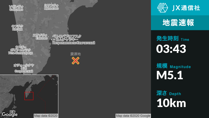 | 震源地 | ロシアのPetropavlovsk-Kamchatskiyから南東156kmの地点 |