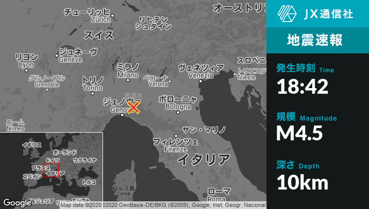 4月16日 18:42頃、イタリアのColiから南南東1kmの地点でM4.5の地震がありました。