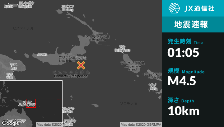 | 震源地 | パプアニューギニアのKimbeから東南東190kmの地点 |
