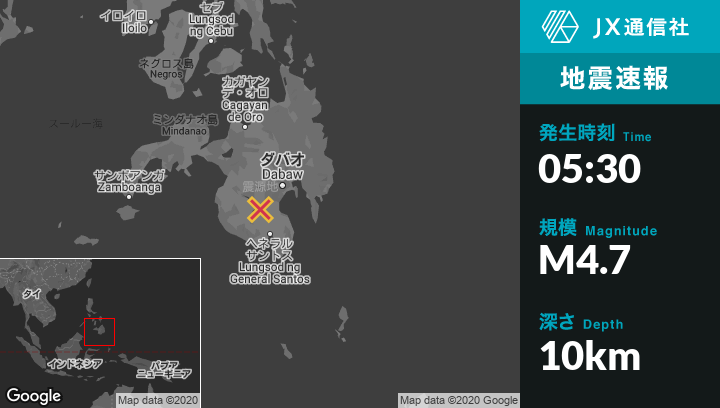 4月20日 05:30頃、フィリピンのBualから東南東7kmの地点でM4.7の地震がありました。