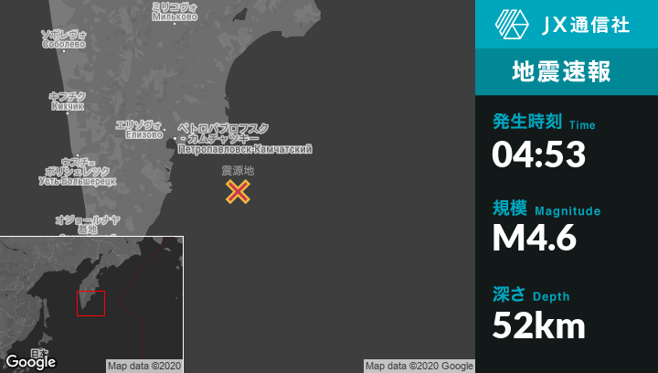 | 震源地 | ロシアのPetropavlovsk-Kamchatskiyから南東127kmの地点 |