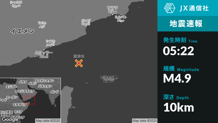 4月23日 05:22頃、イエメンのSayhutから南南東171kmの地点でM4.9の地震がありました。