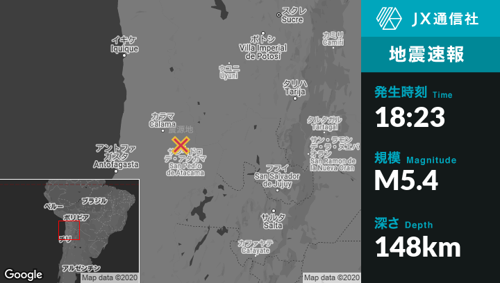 | 震源地 | チリのSan Pedro de Atacamaから北西20kmの地点 |