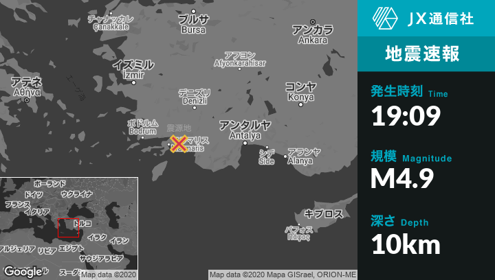 4月30日 19:09頃、トルコのDalyanから北北西15kmの地点でM4.9の地震がありました。