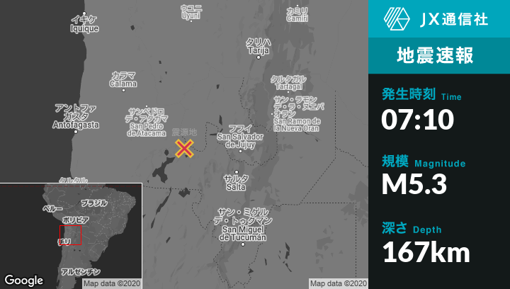 | 震源地 | アルゼンチンのSan Antonio de los Cobresから西北西76kmの地点 |