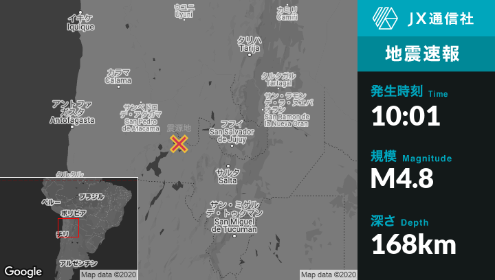 | 震源地 | アルゼンチンのSan Antonio de los Cobresから西北西71kmの地点 |