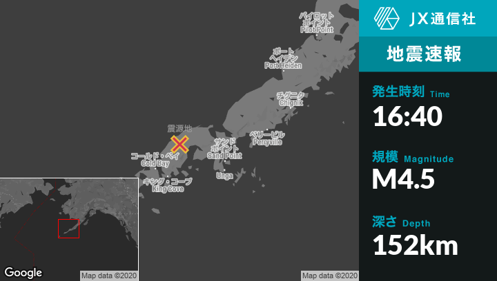 | 震源地 | アラスカのCold Bayから北東77kmの地点 |