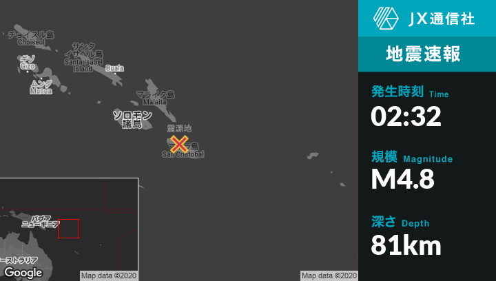 5月05日 02:32頃、ソロモン諸島のKirakiraから北西33kmの地点でM4.8の地震がありました。