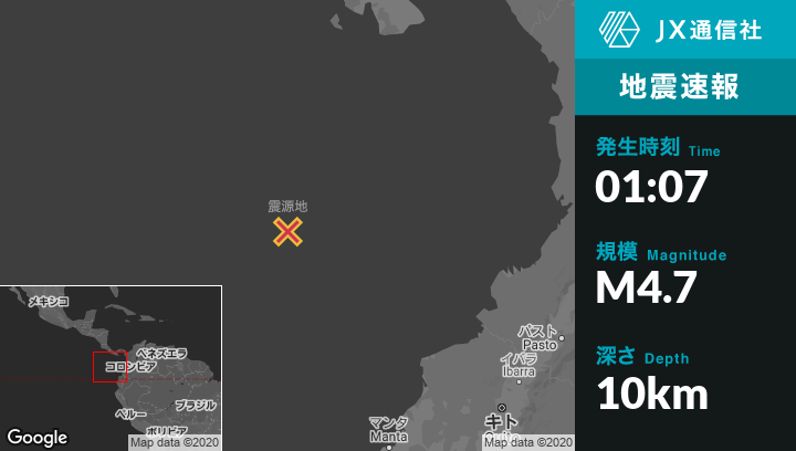 5月06日 01:07頃、エクアドルのMuisneから北西434kmの地点でM4.7の地震がありました。