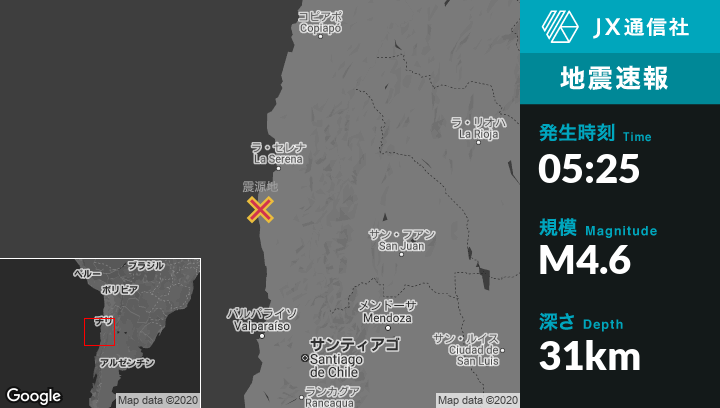 5月06日 05:25頃、チリのOvalleから西43kmの地点でM4.6の地震がありました。