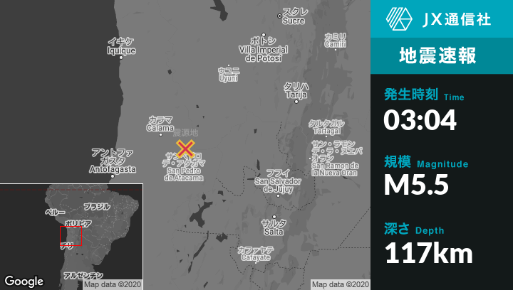 | 震源地 | チリのSan Pedro de Atacamaから北北東19kmの地点 |