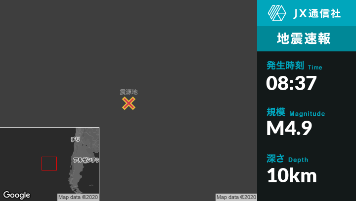5月13日 08:37頃、チリのSan Juan Bautistaから南西1236kmの地点でM4.9の地震がありました。
