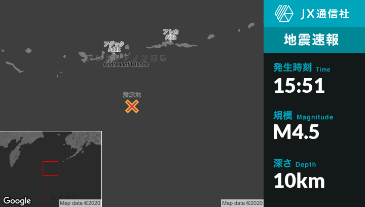 5月15日 15:51頃、アラスカのAdakから南南東161kmの地点でM4.5の地震がありました。