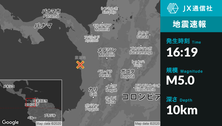 5月19日 16:19頃、コロンビアのNuquiから北西29kmの地点でM5.0の地震がありました。