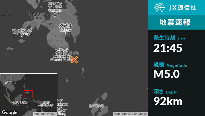 5月20日 21:45頃、フィリピンのSaranganiから東南東72kmの地点でM5.0の地震がありました。