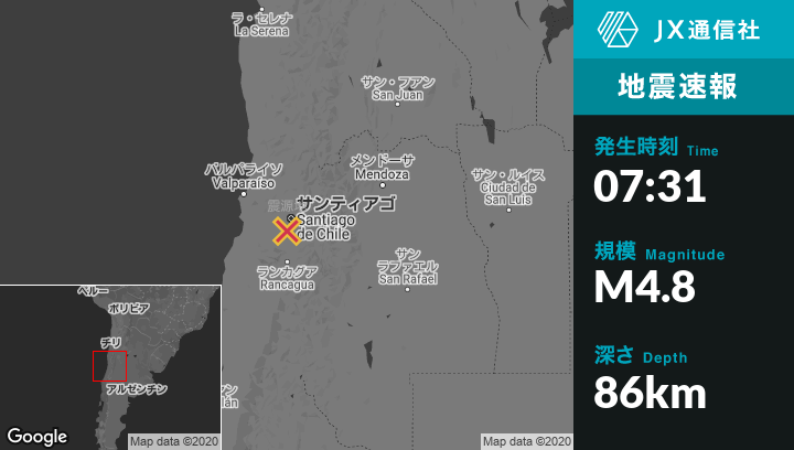 | 震源地 | チリのSan Bernardoから北西5kmの地点 |