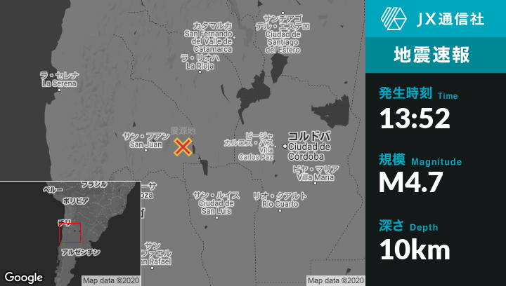 | 震源地 | アルゼンチンのChepesから西75kmの地点 |