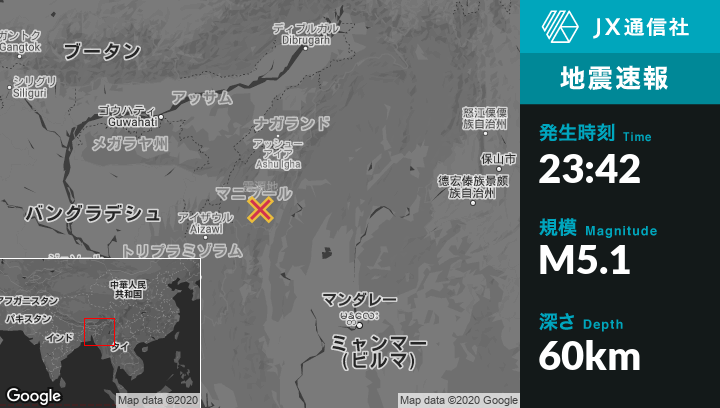 5月25日 23:42頃、インドのKakchingから南西11kmの地点でM5.1の地震がありました。