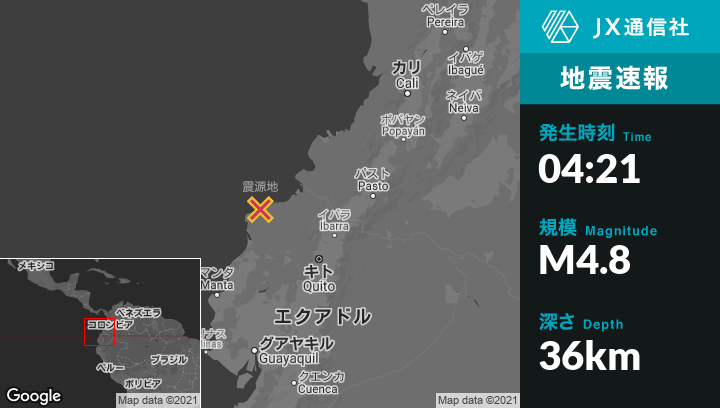 1月16日 04:21頃、エクアドルのEsmeraldasから北西14kmの地点でM4.8の地震がありました。