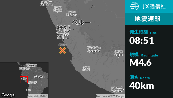 1月16日 08:51頃、ペルーのChilcaから南西50kmの地点でM4.6の地震がありました。