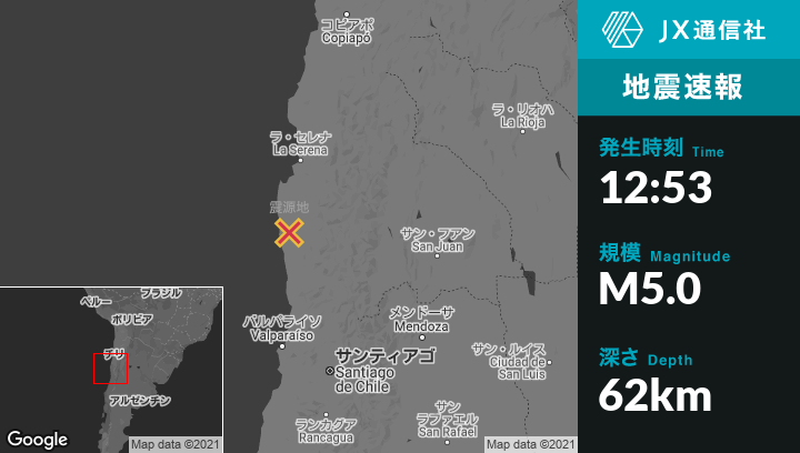 1月16日 12:53頃、チリのOvalleから南南西54kmの地点でM5.0の地震がありました。