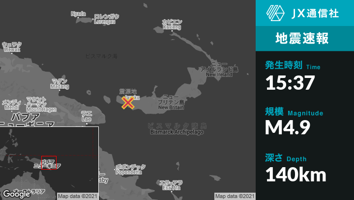 1月16日 15:37頃、パプアのKandrianから北西98kmの地点でM4.9の地震がありました。